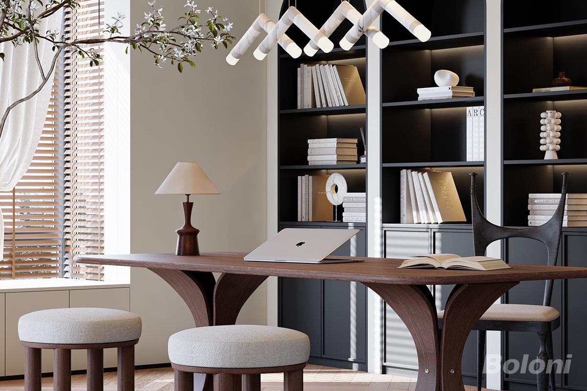 胡桃木曲线书桌搭配拱形收纳柜,复古造型尽显中古质感。墙面留白搭配简约石膏线,中古吊灯散发暖光,花艺与书籍点缀其间,明暗色调巧妙平衡,既保留了复古的沉稳,又通过柔软软装营造出舒适静谧的阅读氛围。
