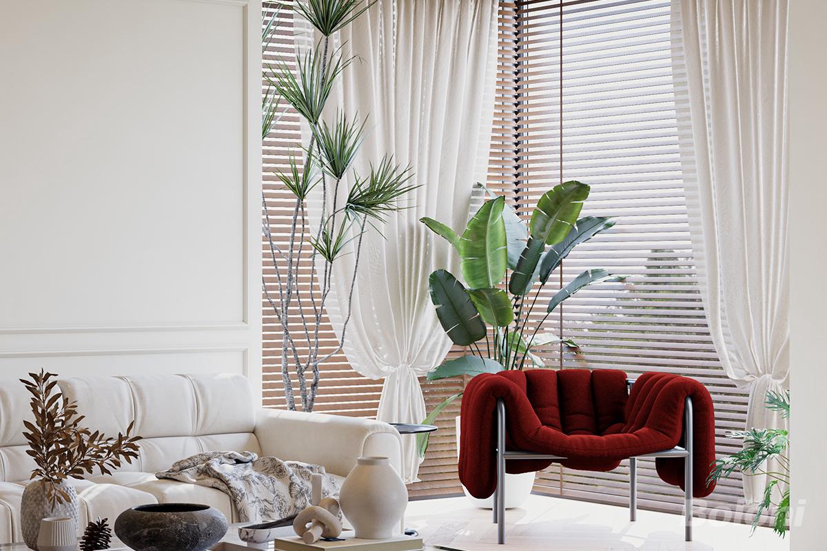 以奶白为主调搭配胡桃木色,法式石膏线勾勒墙面层次,拱形元素点缀空间。奶白绒面沙发搭配复古红单人椅,碰撞出复古韵味,百叶窗引入柔和自然光,绿植与地毯增添温馨感,整体兼具法式优雅、中古质感与奶油风的治愈,松弛又有故事感。