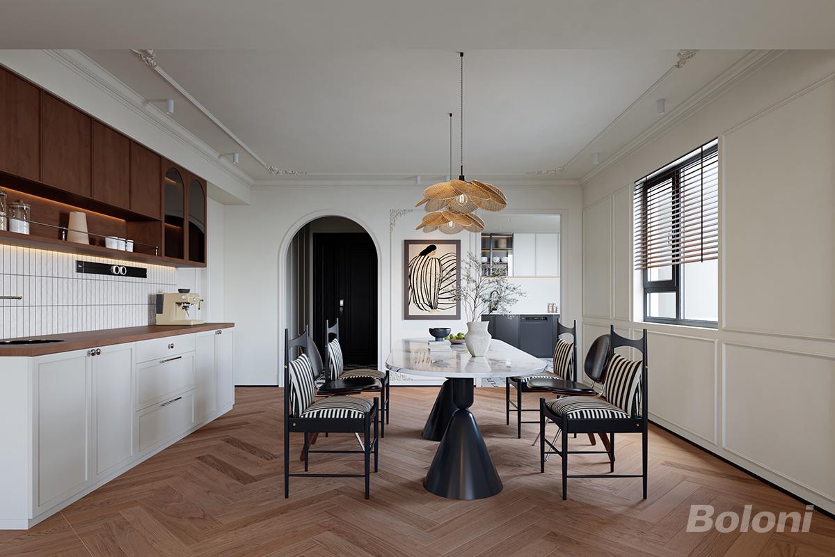延续奶油中古风,木色餐桌搭配复古造型餐椅,质感十足。拱形门分隔空间又保持通透,黑白撞色柜体与木色形成对比,简约线条搭配精致五金,软装以绿植和简约装饰为主,既兼顾餐厨功能实用性,又通过复古元素彰显设计感,精致不繁琐。