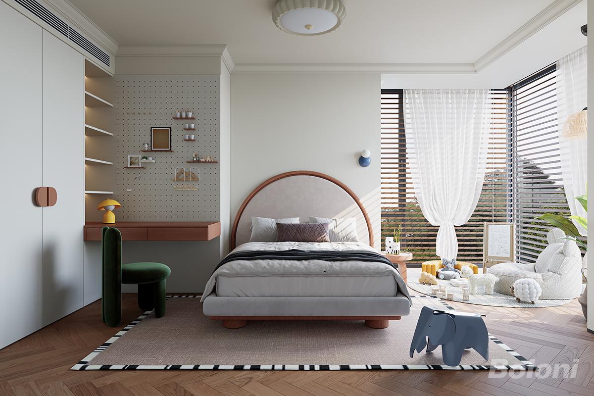 以奶油风为基底融入童趣元素,奶白圆弧床搭配原木色洞洞板,安全又实用。柔和的浅色系软装搭配卡通摆件,木色地板与浅蓝墙面呼应,弱化尖锐棱角,既延续全屋温柔基调,又通过细节设计满足孩童活泼天性,温馨又治愈。