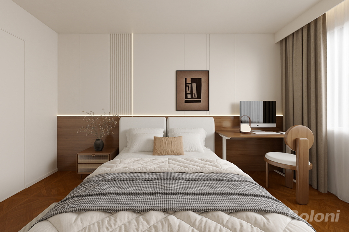 以奶白 + 温润木色为基底,搭配人字拼木地板,柔和中透着精致的复古肌理。 设计细节里全是巧思:床头背景墙用木饰面 + 肌理板拼接,再嵌入氛围灯带,既丰富了层次又营造出松弛的休憩感;床侧直接一体化嵌入书桌,把 “休憩 + 轻办公” 功能做了无缝衔接,搭配复古造型的木椅,实用又不丢风格;软装选了千鸟格床品 + 艺术感装饰画,轻量复古元素让空间更有品味