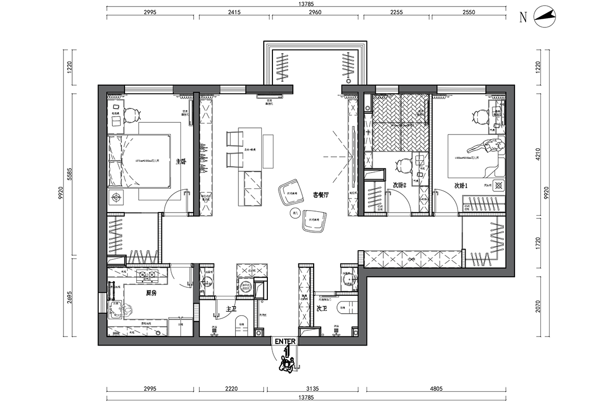 以「动静分区 + 洄游动线」为核心,公共区(客餐厨)做了通透一体化布局,不仅视觉上更显开阔,日常做饭、用餐、休闲的互动感直接拉满;私密区(主卧 + 双次卧)则 “藏” 在两侧,关上门就是互不打扰的安静私域 —— 主卧带独立卫浴 + 专属收纳区,双次卧既能做卧室也能改造成复古书房,灵活适配不同生活需求。