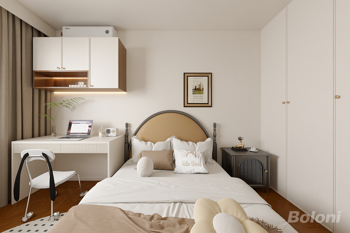 整体以柔和的奶白 + 暖棕为主调,既保留了空间的清爽通透,又用木色、皮质床头等元素铺垫出温柔的复古氛围。 设计巧思直接戳中实用痛点:墙面定制的吊柜 + 书桌,把 “收纳 + 办公” 功能无缝嵌入,灯光藏在柜体层板里,既补充了照明又让氛围更显细腻;弧形床头 + 刺绣抱枕的软装配色,让休憩感更松弛;连小边几都选了复古格栅款,搭配装饰画,把中古风的精致感藏在每一处小物件里。