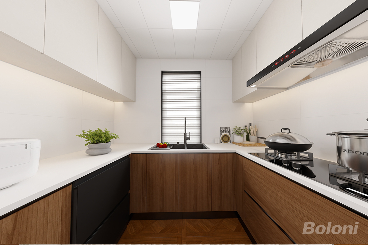 以 “白 + 木 + 黑” 的配色搭出轻复古氛围,吊柜的极简哑光白、地柜的温润木色,再配上人字拼木地板,柔和中透着精致的复古肌理。 设计细节全是实用巧思:L 型操作台把洗、切、炒动线安排得紧凑高效;吊柜 + 地柜的组合藏足收纳,台面留白处还能放小家电;百叶窗既保证了采光又能遮挡油烟,加上嵌入式灯光的点缀,做饭时的氛围和效率都直接拉满