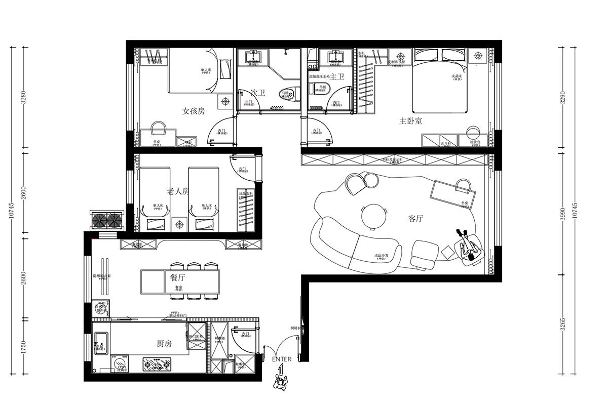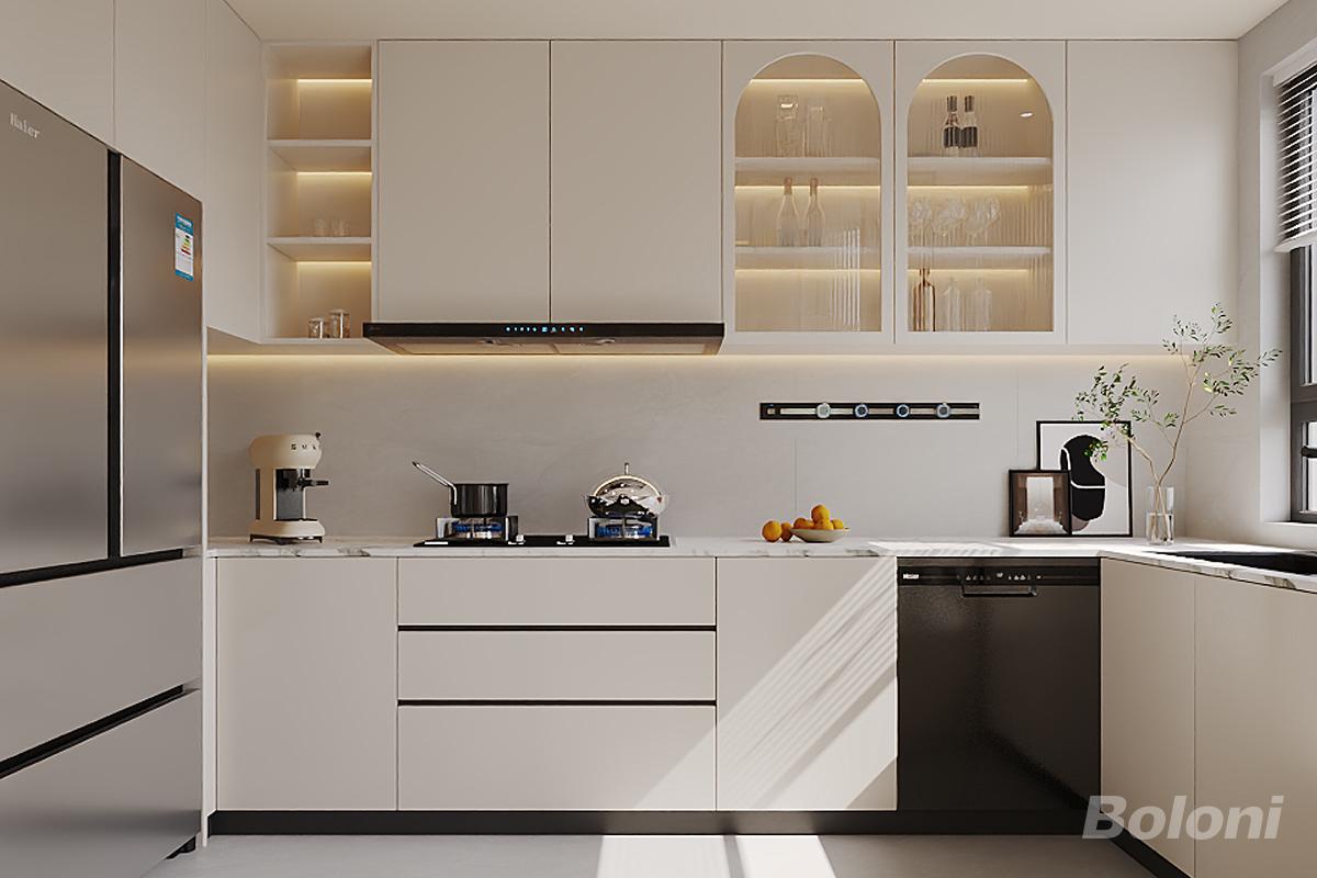 项目地址位于朝阳区福熙大道,客户中意明亮温馨又不缺点缀的“轻法式”, 家具:采用轻奢风圆形岩板餐桌 + 奶油色软包餐椅(搭配金色金属腿),兼顾质感与舒适感;右侧设置嵌入式储物柜(含玻璃门 + 灯光),增加收纳与精致感。 隔断:采用玻璃 + 金属线条的屏风,既分隔空间又保持通透,适配小户型的采光需求。 细节:搭配水晶质感吊灯、墙面线条装饰、嵌入式灯带,强化轻奢与温馨属性;背景可见洗衣区(嵌入洗衣机),体现空间的多功能整合。
