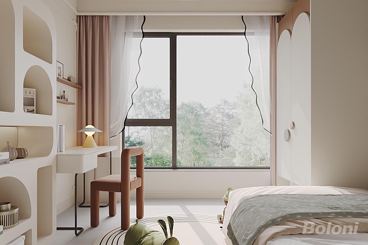 以柔和的奶油色系为基底,融入圆润弧线、趣味造型等童趣元素,兼顾温馨感与儿童空间的活泼属性。 左侧设嵌入式弧形置物架 + 书桌,实现收纳、学习功能的一体化,适配儿童房的小空间利用需求;右侧为带装饰造型的衣柜,保持风格统一。
