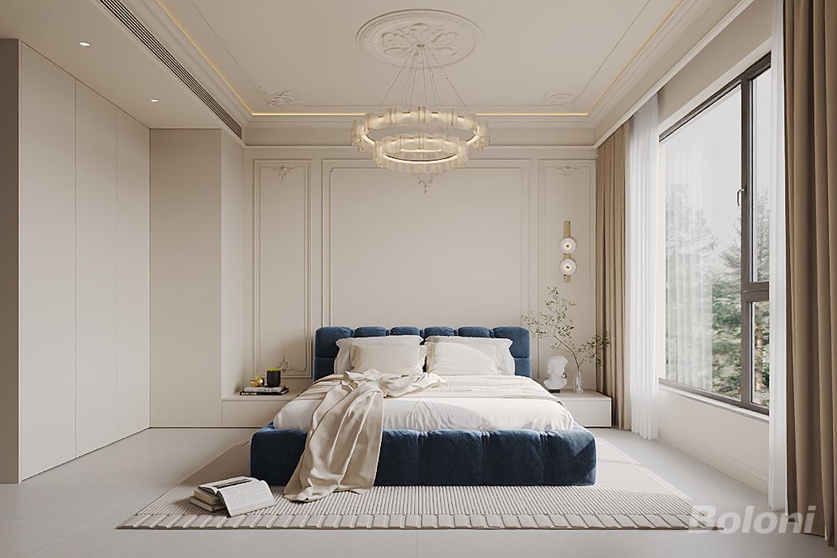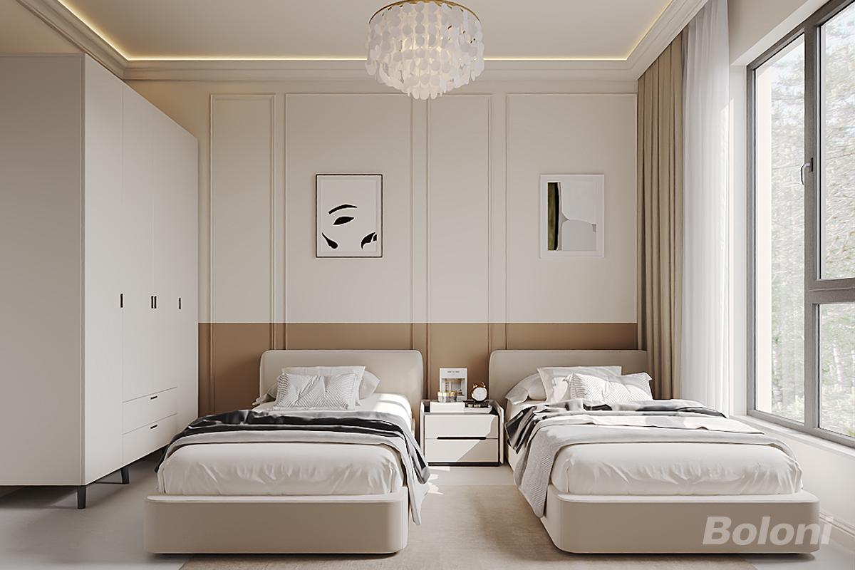配备两张同款式软包床 + 共享床头柜,适配双人居住需求;左侧设通顶衣柜(含抽屉区),实现收纳功能的最大化。 墙面采用分色护墙板 + 石膏线条,增强空间层次感;搭配艺术装饰画、花瓣造型吊灯,提升空间精致度;大窗户保证充足采光,适配卧室的舒适需求。