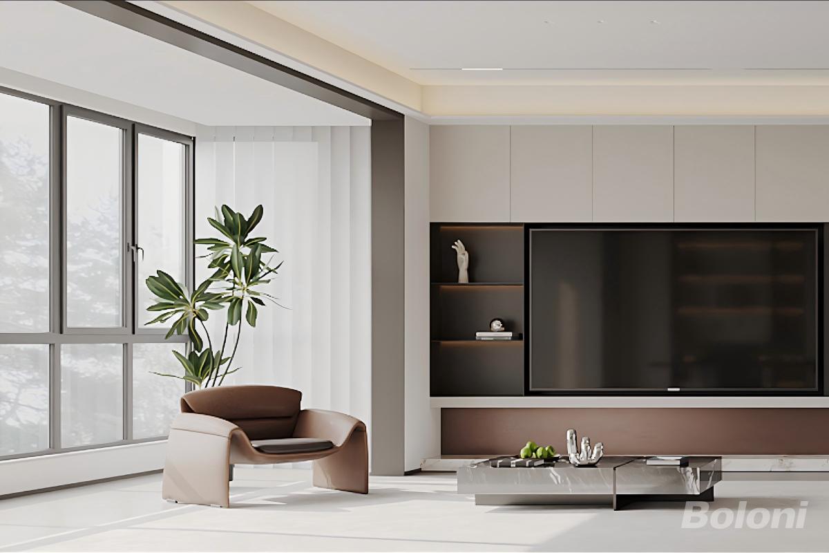 以低饱和的米白、浅灰为基底,搭配深棕(沙发)、金属黑(茶几)形成层次,避免视觉杂乱; 运用岩板(背景柜)、皮革(沙发)、金属(装饰摆件)等材质,强化质感对比; 采用嵌入式筒灯 + 背景柜氛围灯的组合,实现基础照明与氛围营造的双重功能。