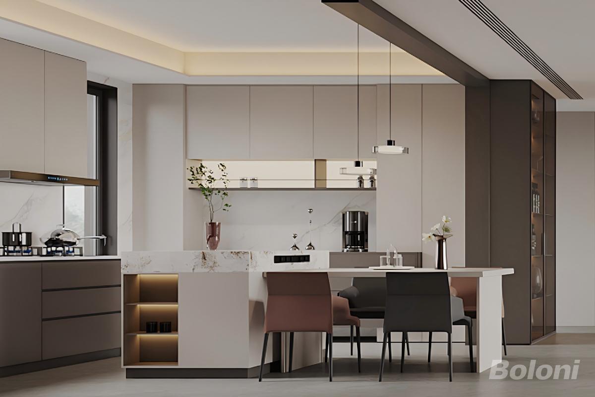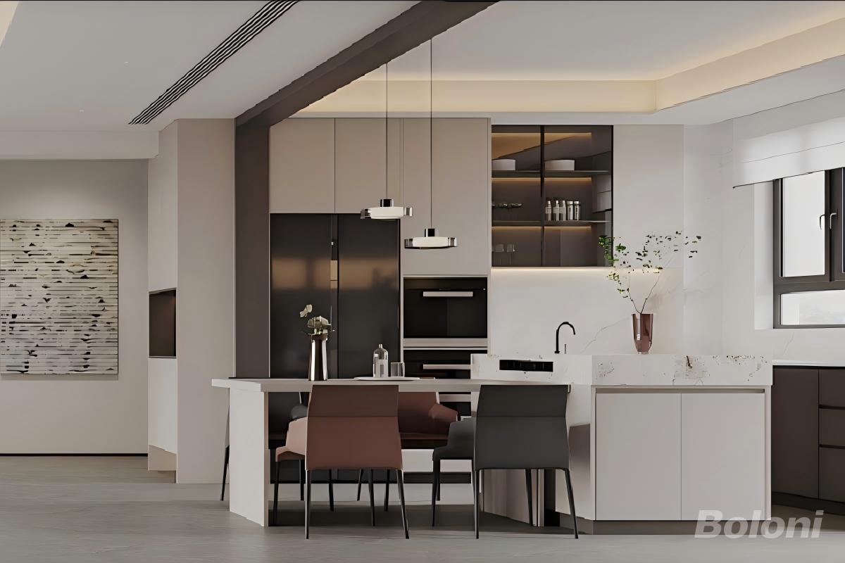 以米白、浅灰为基底,搭配深棕(柜体)、金属黑(家电 / 五金)形成低饱和层次,避免视觉杂乱;运用岩板(中岛台面)、哑光板材(橱柜)、玻璃(展示柜)等材质,兼顾耐用性与通透感;中岛兼具备餐、用餐功能,高柜整合收纳(厨具 / 餐具)与展示功能,嵌入式家电节省空间; 细节巧思:通过玻璃展示柜呈现藏品、花艺软装柔化硬质线条,深色家电与柜体形成视觉焦点,弱化厨房的 “工具属性”,强化空间的生活美学属性。