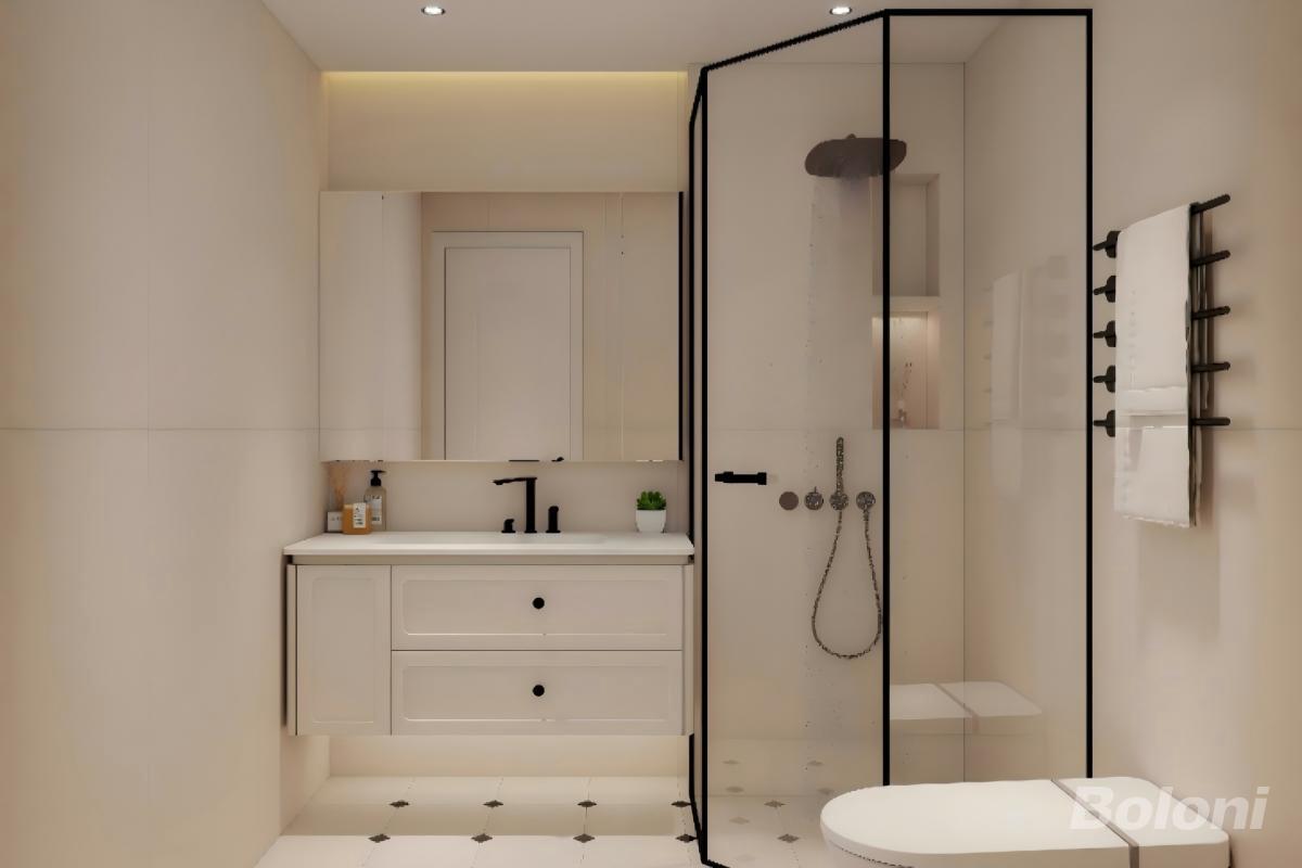以 “实用整洁 + 轻质感” 为核心,适配多数住宅的卫浴空间需求; 功能集成 “洗漱 + 淋浴 + 如厕” 的基础卫浴功能,通过分区设计提升使用效率。通过玻璃隔断划分淋浴区与干区,实现干湿分离,提升空间整洁度与安全性;浴室柜采用悬挂式设计(便于清洁地面),镜柜整合收纳功能(隐藏洗漱用品),地面小尺寸花砖点缀增强细节层次。