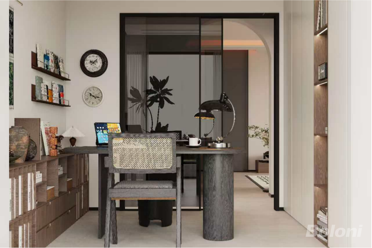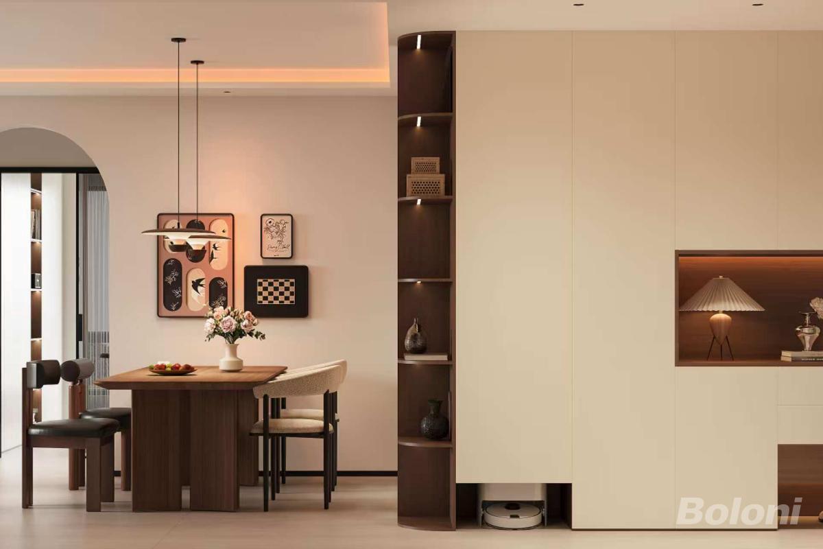 聚焦客餐与入户过渡区,拱形门洞柔化空间边界,深棕实木餐桌搭配简约餐椅,墙面挂置复古艺术画;右侧一体化收纳柜结合木质格栅与内嵌灯光,打造出兼具收纳与展示的入户端景,中古风的家具与现代收纳系统结合,层次丰富。