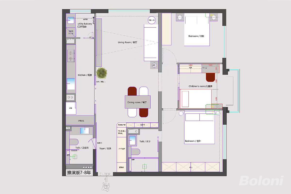 这张图是适配家庭7-8年居住需求的三居室平面推演方案,以全龄化、成长性为核心设计逻辑,整体布局兼顾功能实用性与空间弹性