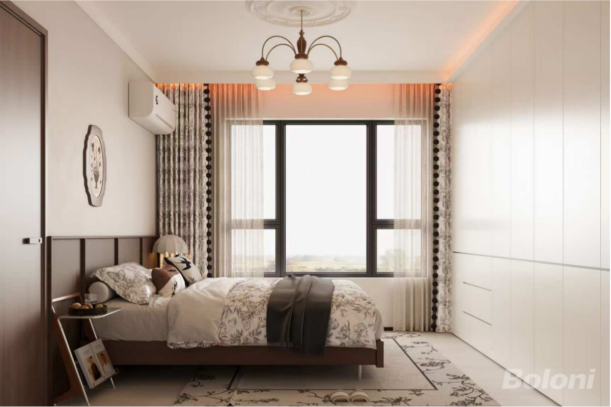 呈现卧室空间,整体以米白+深棕为主色调,整面定制衣柜最大化利用收纳空间,床头搭配复古花纹床品与雕花吊灯,窗边花纹窗帘增添柔美感,自然光透过落地窗洒入,让空间温馨又雅致。
