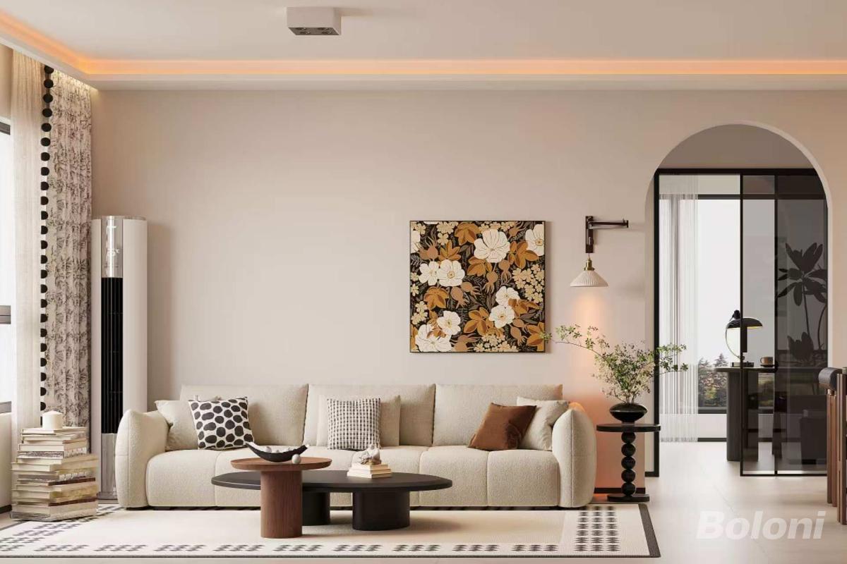 是客餐区的另一视角,弧形拱门成为空间过渡的视觉亮点,浅米色沙发搭配黑白花纹抱枕,与餐桌区的复古艺术画、花艺摆件形成视觉联动,线性顶光勾勒出空间轮廓,整体氛围温馨且富有艺术气息。