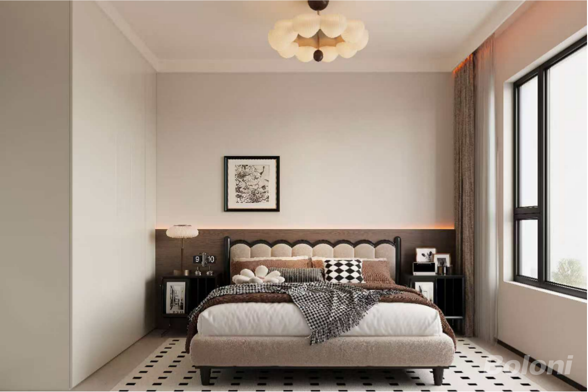 主色调采用米白+深棕的经典搭配,墙面为柔和的米白色,床头与家具选用深棕实木,材质的冷暖对比让空间质感更丰富;地面浅灰色瓷砖与花纹地毯结合,增添复古肌理。
