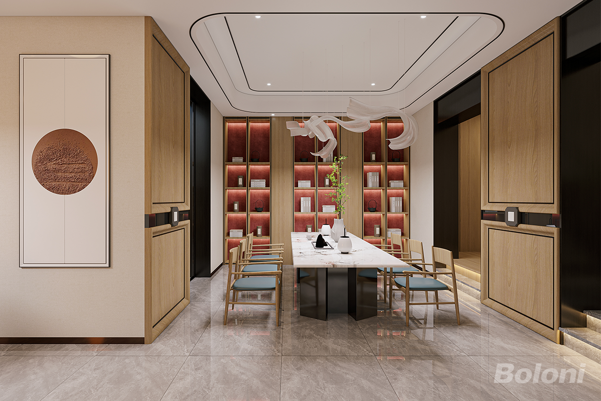 延续木饰面基调,红绒背板与艺术挂画强化东方质感,大理石茶台搭配浅蓝座椅,平衡厚重与轻盈;暗藏灯勾勒收纳架层次,让空间在传统韵味中兼具展示与社交功能,适配茶叙与藏品陈列。