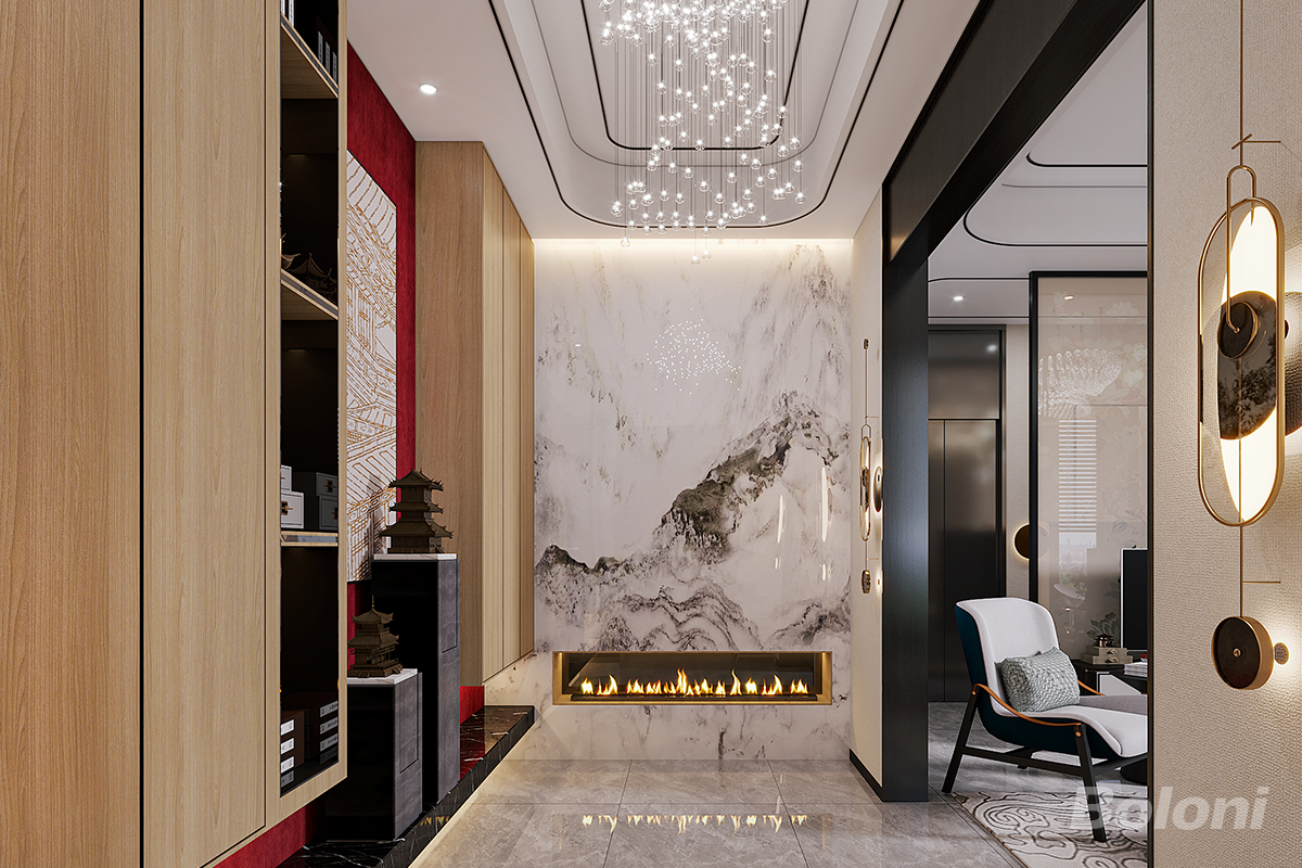 玄关以水墨纹大理石墙为视觉核心,嵌入式壁炉增添暖意,水晶吊灯强化轻奢质感;木饰面收纳架与红绒背板呼应新中式基调,艺术摆件与灯光结合,让过渡区域兼具仪式感与展示功能,成为空间的美学起点