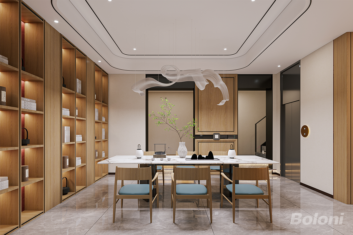品茗区以整面木饰面书架铺垫温润氛围,浅蓝座椅平衡色调,艺术吊灯如 “飘带” 柔化空间;茶具与绿植点缀其间,既保留新中式的雅致,又以简洁线条适配现代品茗场景,实现功能与美学的统一。