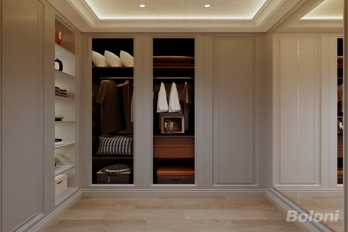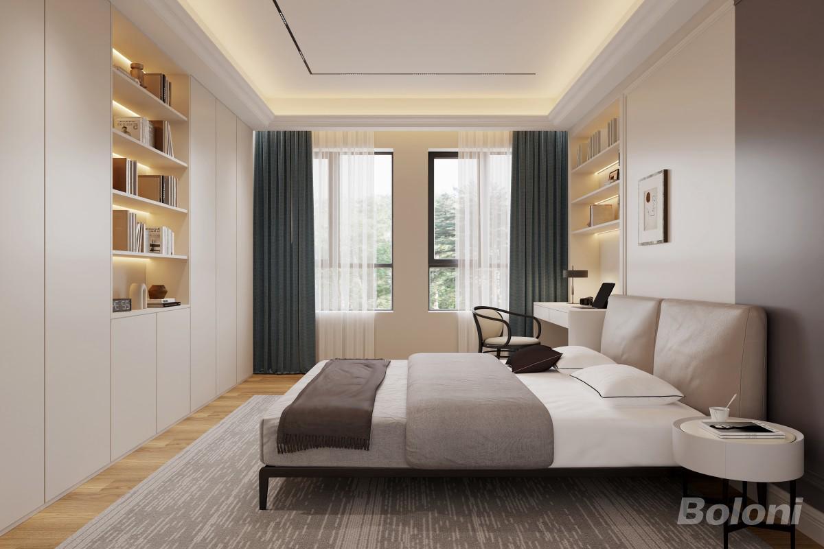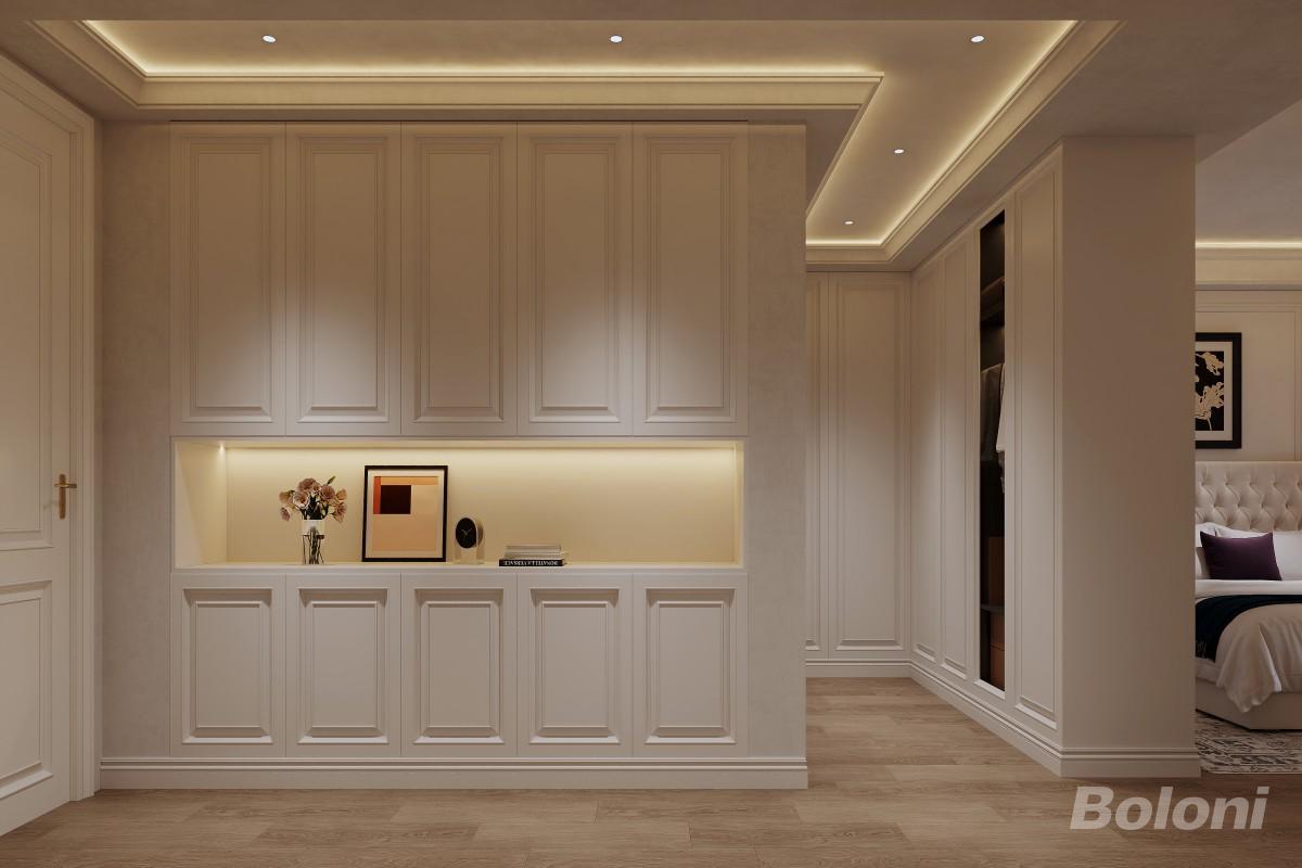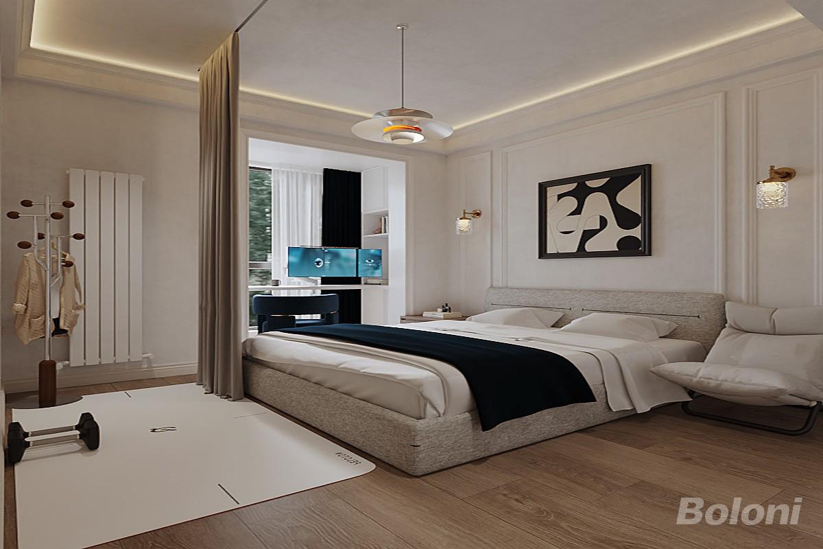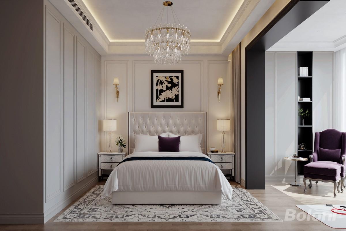 法式宫廷的优雅升级 以精致护墙板、雕花石膏线为基础,搭配软包床头(拉扣工艺)、水晶吊灯、金色金属灯具,延续法式宫廷的奢华质感;深色装饰框、紫色软装作为点缀,强化空间的高级氛围。核心配置睡眠区 + 对称床头柜,右侧设置休闲椅 + 小边几,满足睡前阅读、放松的轻休闲需求;连通的开放式置物区兼顾收纳与展示,提升空间实用性。