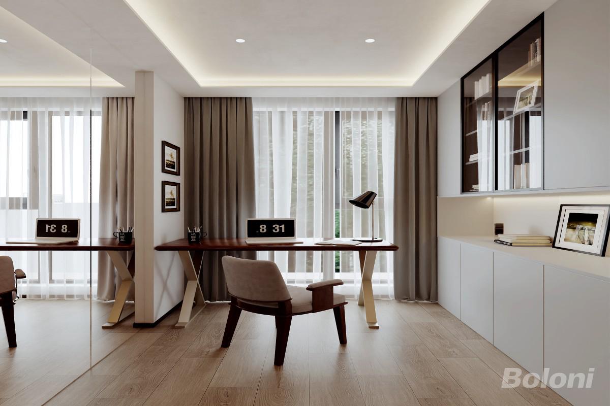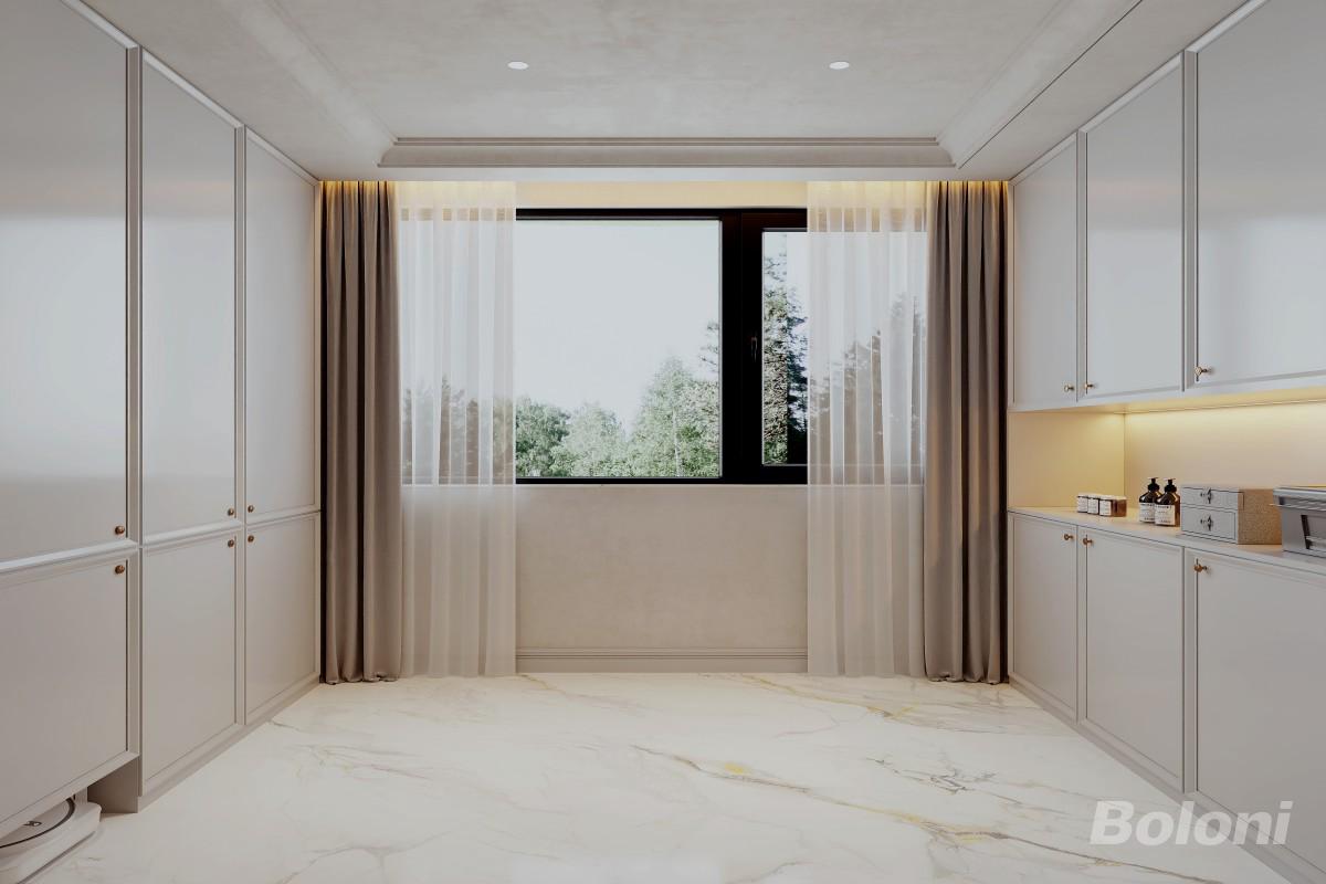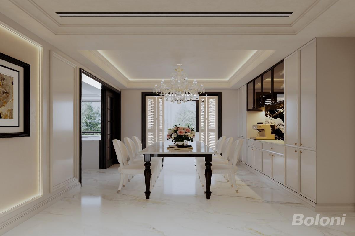 风格元素:优雅的仪式感 墙面采用法式护墙板 + 石膏线条造型,搭配水晶吊灯、雕花桌腿等元素,通过对称布局与精致细节,营造法式特有的优雅用餐仪式感;地面选用大理石材质,提升空间奢华质感。功能整合:实用与美观兼顾 右侧设置一体化餐边柜(封闭收纳 + 玻璃展示 + 内嵌电器区),既满足餐具、饮品的收纳需求,又通过展示柜强化轻奢氛围;百叶窗设计兼顾采光与隐私,适配用餐场景的光线调节。