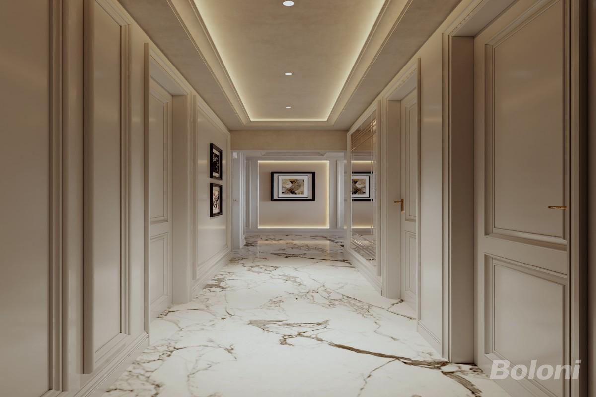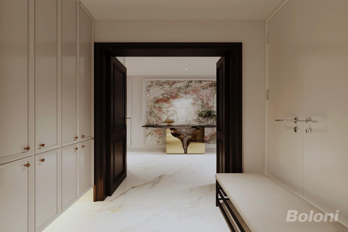 作为玄关的视觉焦点,材质采用柔光护墙板、大理石台面、金属底座,通过柔和(护墙板)、厚重(大理石)、精致(金属)的质感碰撞,强化空间的奢华层次;色彩以奶油白 + 黑金 + 艺术画的高饱和色彩为主,既保持基调的柔和,又通过亮点元素提升视觉张力。