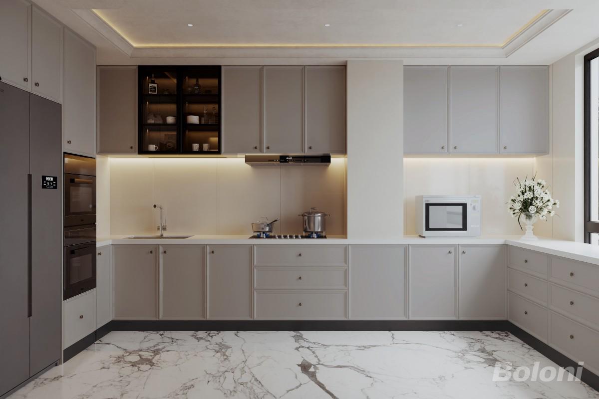 以浅灰色哑光柜体 + 大理石纹地面为基底,搭配黑色玻璃展示柜、金属五金件,通过材质的哑光质感(柜体)、通透感(玻璃)、精致感(五金)形成层次,兼顾现代简洁与轻奢质感;墙面采用柔光护墙板,弱化厨房的冰冷感。整合水槽、灶台、收纳区,符合 “洗 - 切 - 炒” 的厨房动线,操作效率更高;左侧嵌入双烤箱 + 冰箱,右侧设置抽屉式收纳与台面空间,最大化利用厨房面积。