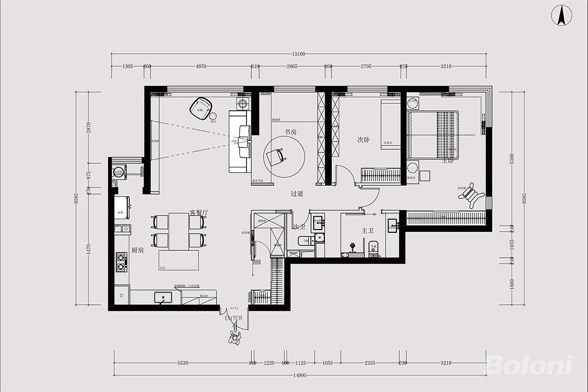 动线设计:入户后通过过道串联各功能区,客餐厅与书房、卧室的动线互不干扰,动静分区明确。
