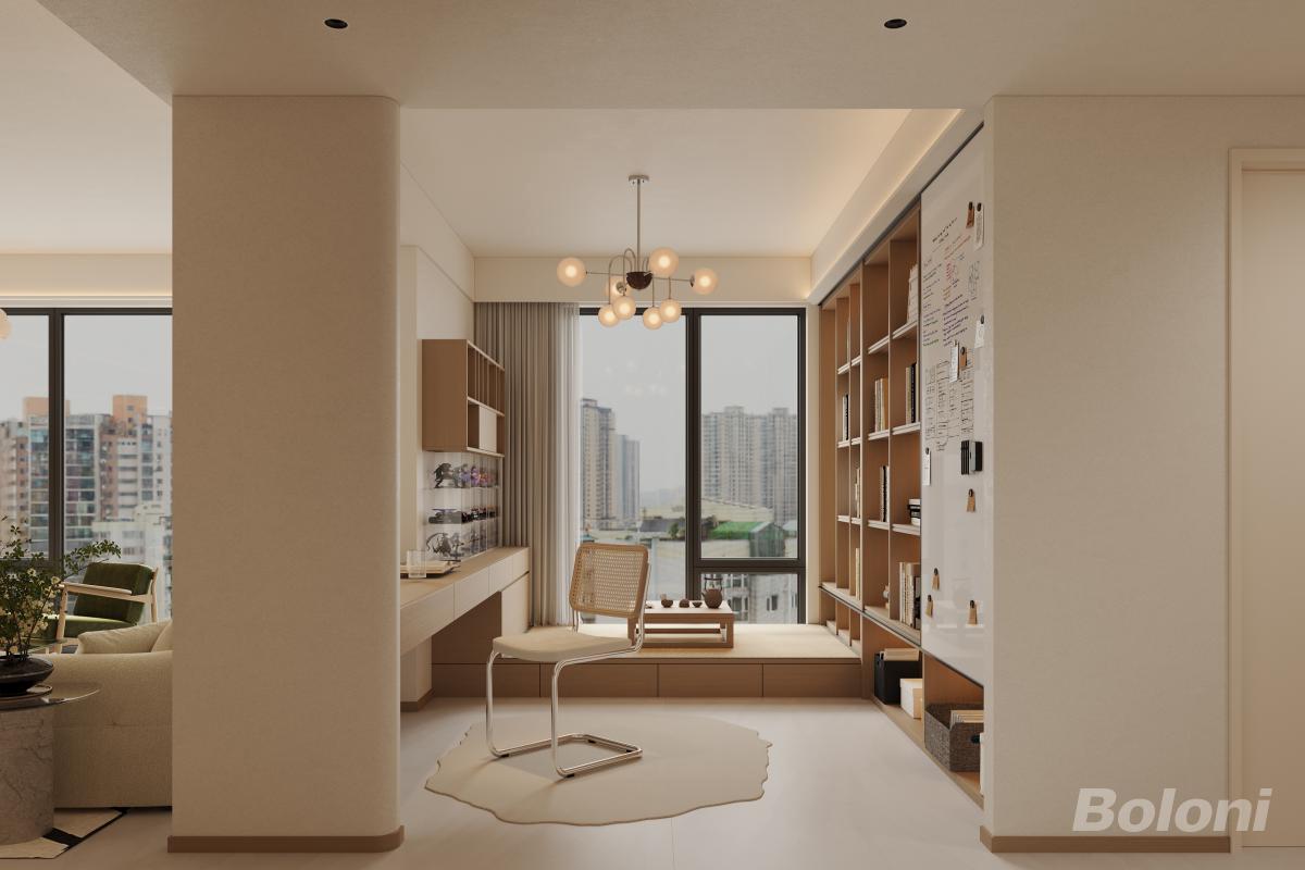书房/休闲区,靠窗设悬浮式书桌与藤编座椅,旁侧是开放式木质书架与白板墙,吊灯延续奶油风的圆润造型,结合落地窗的自然采光,打造出舒适的办公休闲角落。