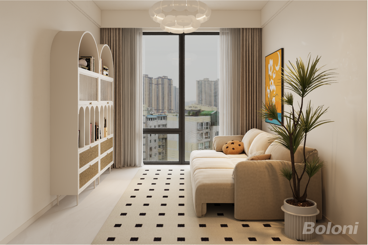 次客厅/休闲区,浅米色布艺沙发搭配黑白格纹地毯,一侧是拱形开放式展示柜,落地窗前摆放绿植,吊灯采用琉璃质感的造型,空间简约又不失艺术氛围。