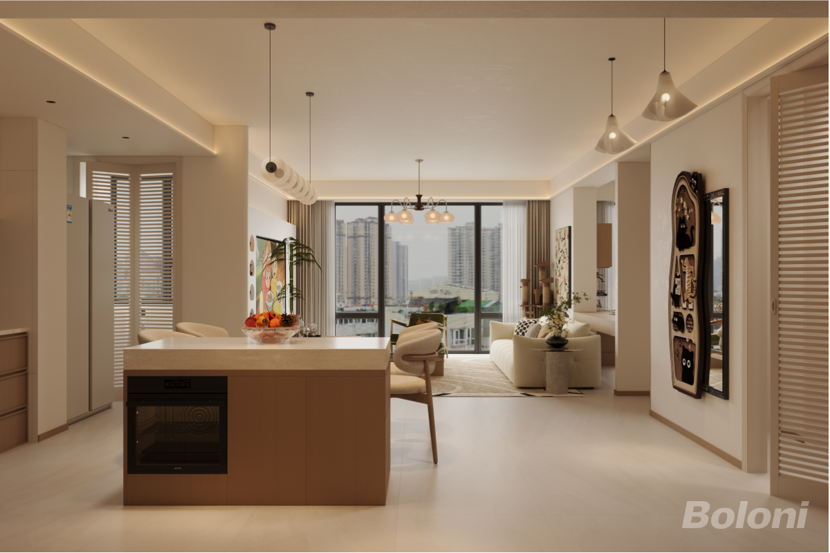 从餐厨区望向客厅的视角,中岛台嵌入黑色厨电,浅木色柜体与白色墙面呼应;顶部无主灯设计搭配线性灯带,远处客厅落地窗引入城市景观,空间通透且层次分明。