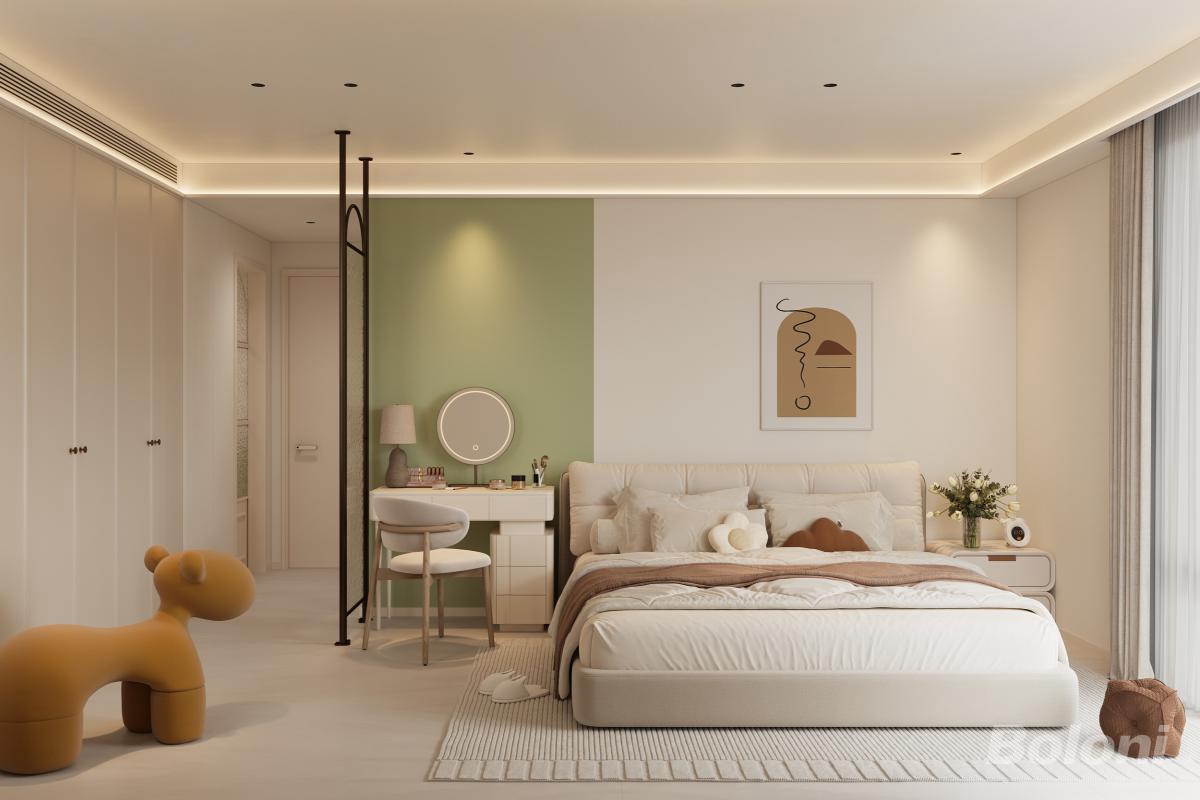 主卧空间,整面白色定制衣柜搭配金属长虹玻璃隔断,床头背景墙拼接抹茶绿乳胶漆,摆放软包大床与白色梳妆台,角落的棕色艺术小马摆件增添可爱感,灯光设计柔和温馨。