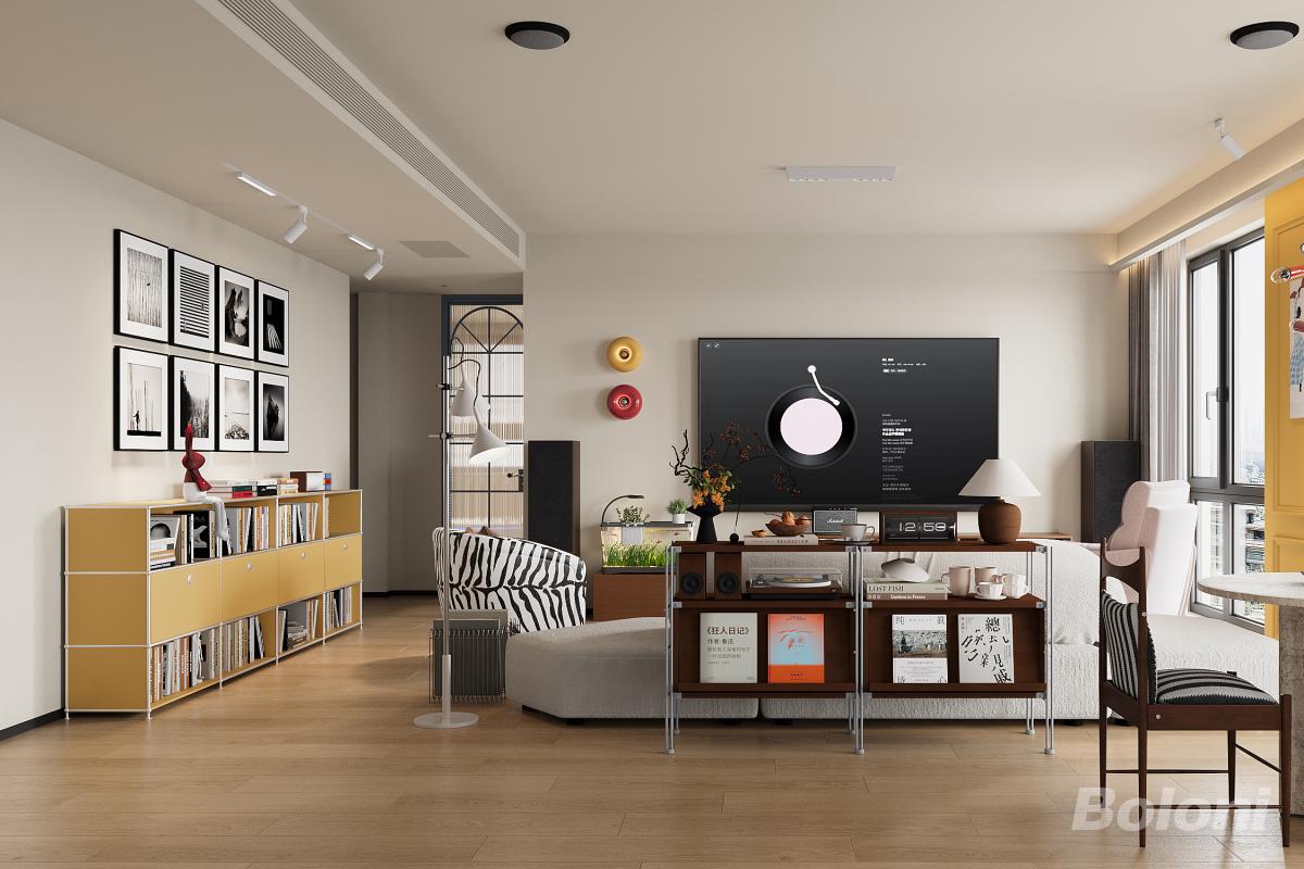 客厅另一视角,电视墙旁设黄色开放式书架,陈列书籍与艺术摆件;电视下方是金属框架的收纳柜,摆放书籍与装饰,旁侧是简约石质餐桌,空间动线流畅,功能与美学结合。
