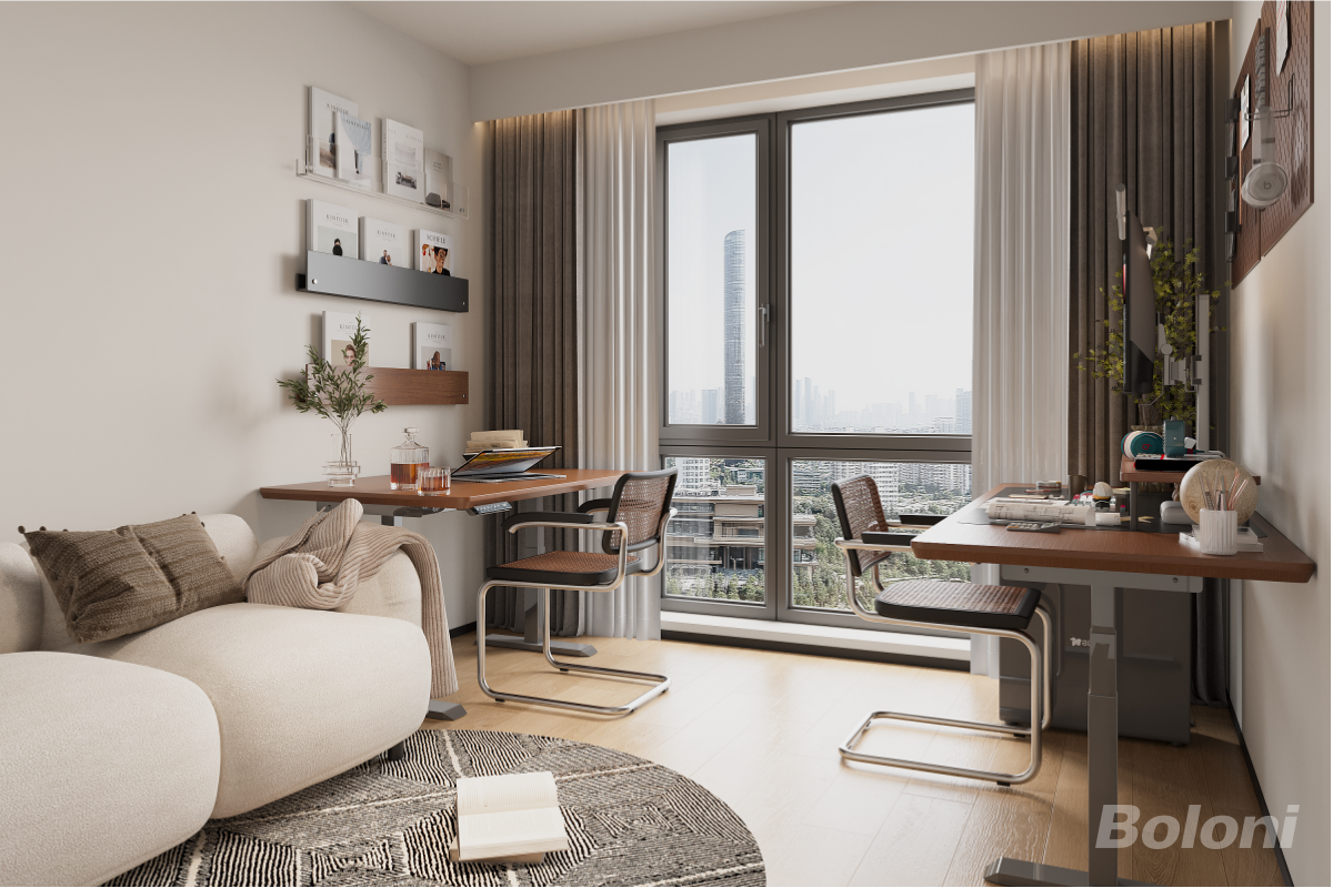 书房/工作区,靠窗设双木质书桌,搭配金属支架座椅,采光充足;一侧摆放米色布艺沙发,墙面挂装饰画与收纳架,既是办公区也可作为休闲角落,功能灵活。