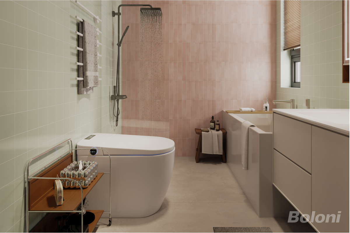 卫浴空间,左侧浅绿瓷砖搭配智能马桶,淋浴区用粉色竖纹瓷砖打造撞色效果,右侧是白色浴室柜与浴缸,柔和的马卡龙色系让卫浴空间清新又独特。