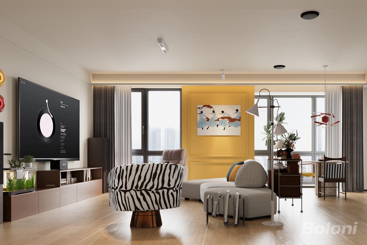 客厅核心视角,浅灰色模块化沙发搭配彩色抱枕,左侧是藕粉色旋转单人椅,右侧斑马纹单人椅形成视觉冲击;背景是开放式餐吧区,柜体嵌入玻璃与木质元素,明黄墙面挂艺术画,整体混搭轻奢与艺术感。