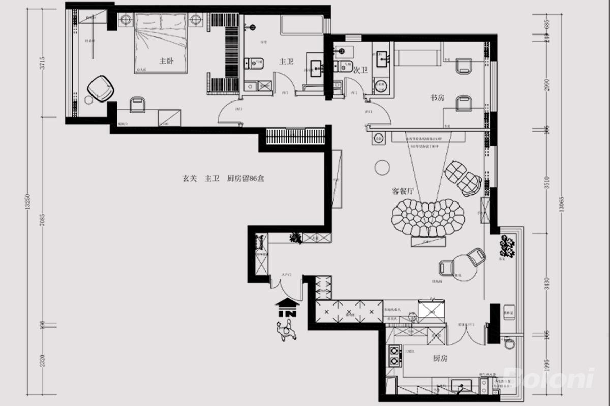 主卧套间:整合主卫与开放式衣帽间,打造私密且舒适的睡眠区,床头区域预留休闲与收纳功能。