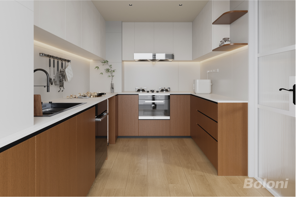 4. 第四张图:厨房空间,采用白棕撞色的一字型布局,白色吊柜搭配木色地柜,嵌入式厨电节省空间;长虹玻璃门做隔断,操作台面预留充足,兼顾实用性与颜值。