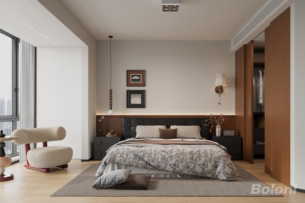 主卧空间,深木色床头背景搭配黑色软包,床品用浅灰与棕色营造温馨感;窗边摆放艺术感单人椅,侧边是开放式木质衣帽间,灯光设计柔和,兼具私密与设计感。