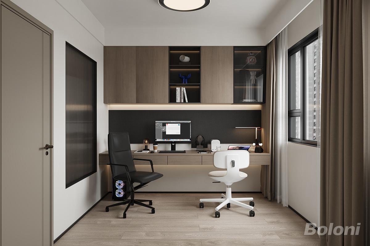 以木色为基底,整合收纳与办公功能,保障工作效率;黑灰细节 + 灯光点缀添轻奢质感,潮玩摆件注入活力,让办公空间既有序实用,又兼具松弛的现代氛围。