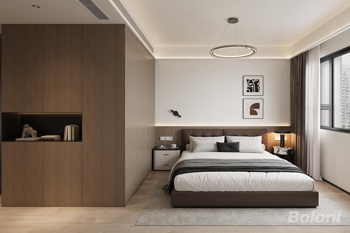 以木色为基底,整合收纳与休憩功能,保障空间秩序;黑棕细节 + 灯光点缀添轻奢质感,艺术装饰注入雅致氛围,让睡眠空间既松弛舒适,又兼具现代精致的居住质感。