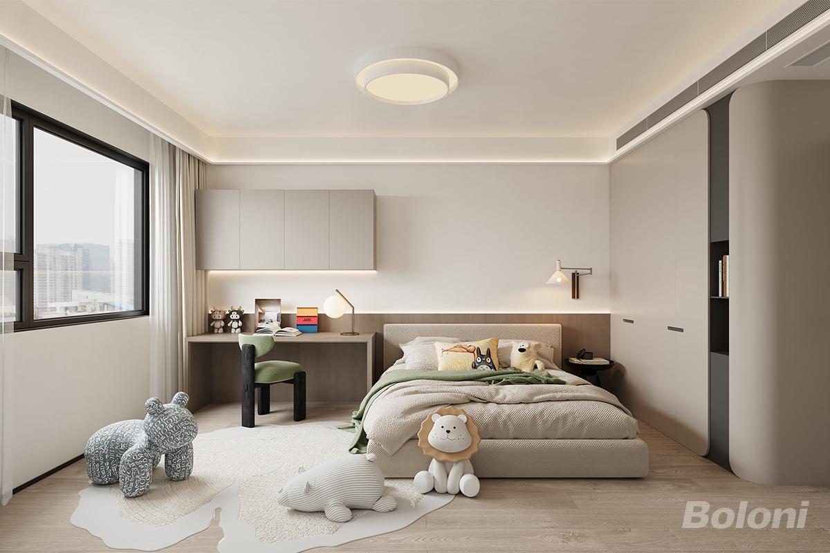 以浅调为基底,整合休憩、学习与收纳功能,布局简洁有序;柔和灯光与童趣摆件注温馨活力,适配儿童成长;一体化柜体兼顾实用,让空间兼具舒适与生活质感。