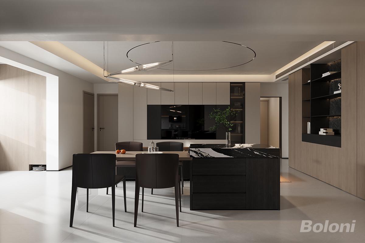 开放布局消弭餐厨边界,让互动动线更舒展;木色基底搭黑灰、石纹与金属细节,在极简中透出轻奢质感;岛台整合收纳功能,既保障烹饪用餐效率,也营造出松弛高级的生活场域。