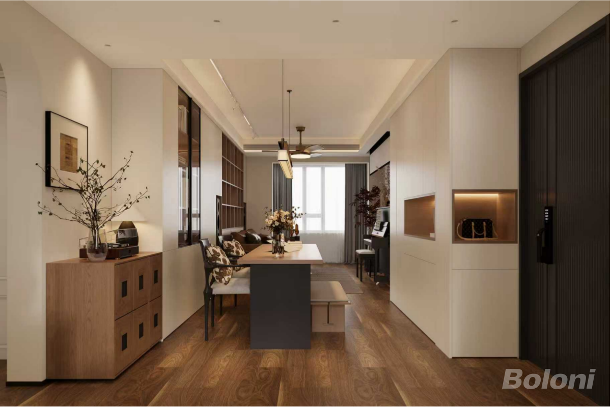 为入户看向客餐厅的全景视角,左侧是入户端景柜与花艺装饰,餐区餐桌居中,后方客厅空间通透延伸;右侧定制柜嵌入展示格与隐形门设计,深色木纹地板通铺,让客餐厨三个区域既独立又连贯,动线流畅且视觉上更显开阔。