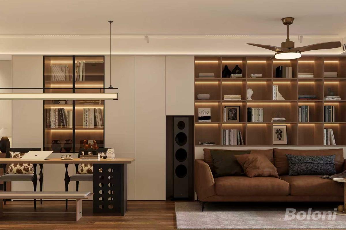 客厅与主餐区的全景,棕色皮质沙发旁立着黑色音响,背景是整面定制开放式书架,灯带营造出静谧的阅读氛围;餐区长条餐桌搭配艺术感灯具与座椅,金属、木质、布艺等材质碰撞,复古与现代元素融合,打造出兼具社交、休闲与阅读功能的复合型空间。