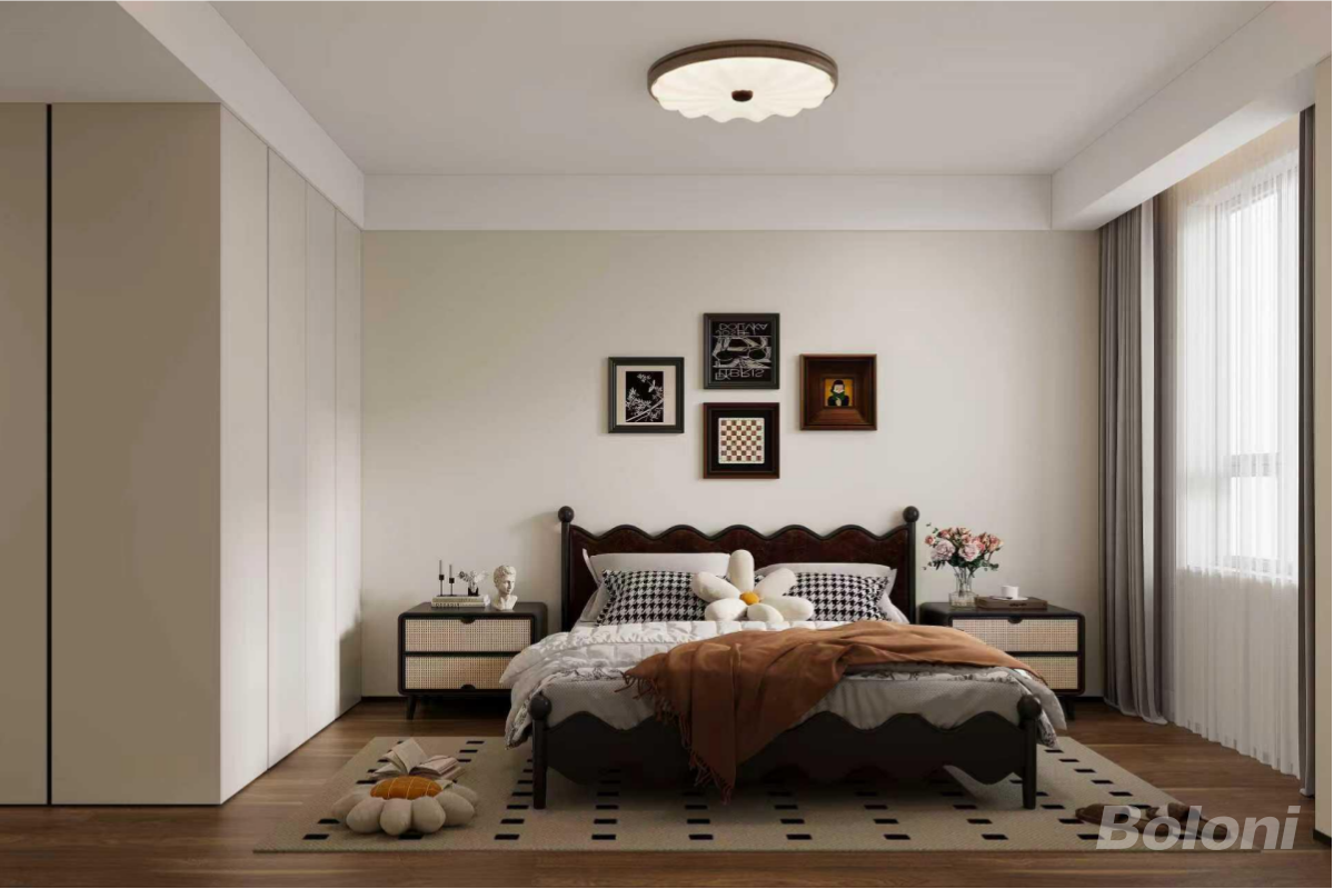 主卧,整体风格简约舒适。房间内摆放着一张深色木质双人床,床头两侧是床头柜,上面摆放着台灯和装饰品。床头背景墙上挂着三幅不同风格的装饰画,靠墙一侧是整面的白色衣柜,地面铺有木质地板,窗边挂着灰色窗帘,整体给人一种宁静放松的感觉。