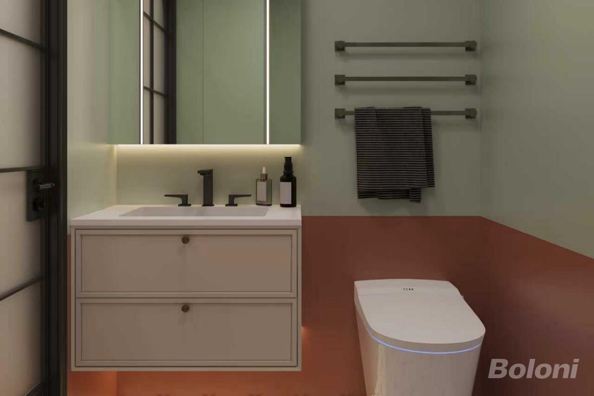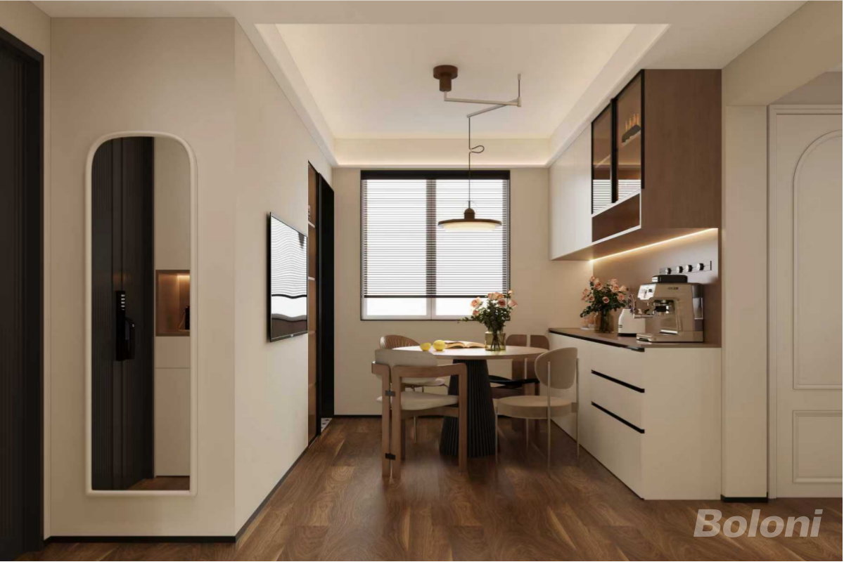 展示次用餐区与西厨区,圆形餐桌搭配简约餐椅,窗边百叶帘控制采光;右侧西厨柜整合了咖啡机等厨电,暖光灯带勾勒柜体轮廓,法式弧形造型门洞与白色护墙板呼应,细节处凸显精致感,满足日常轻食与小聚用餐需求。
