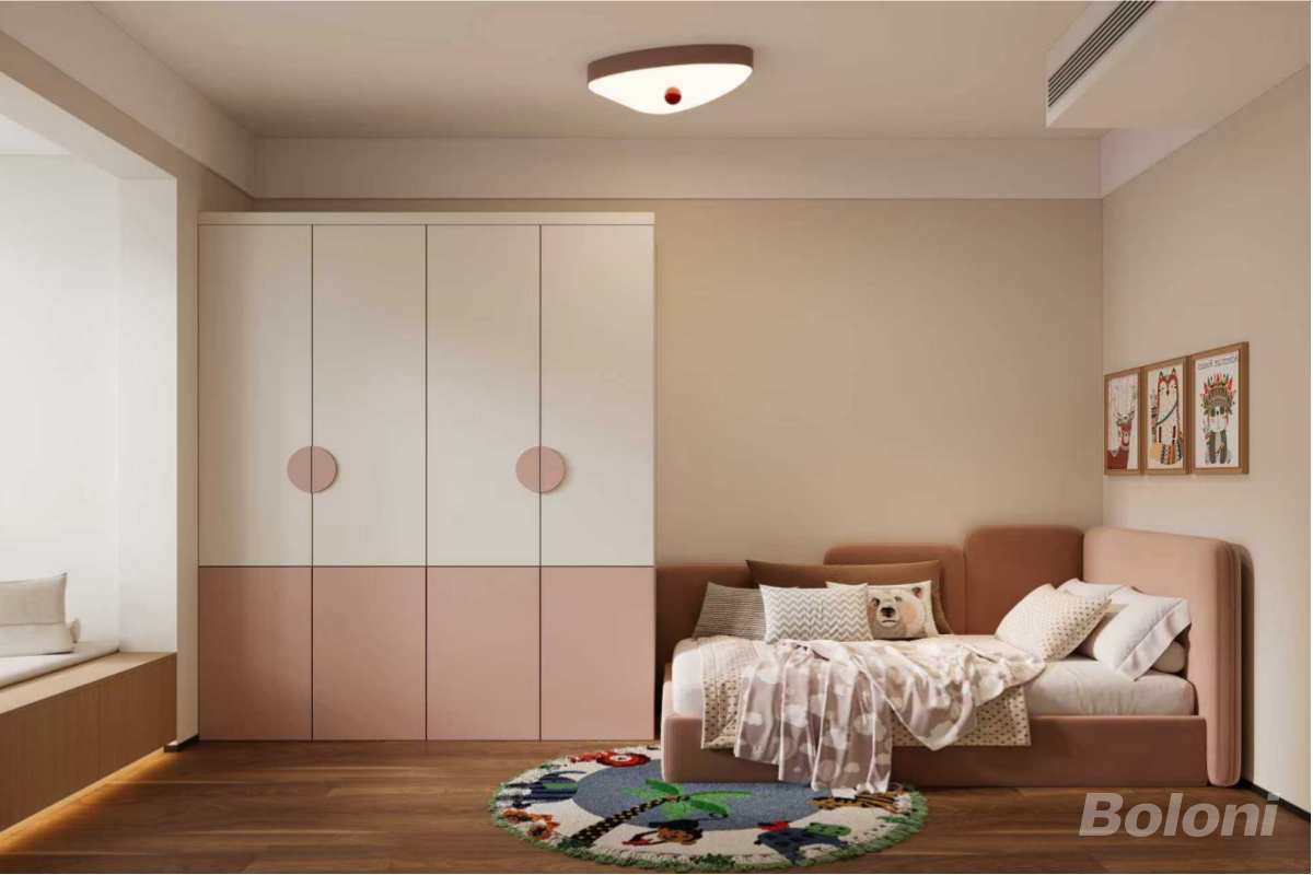 另一间儿童房,采用米白色和浅粉色的搭配。房间内有一张浅棕色的L型沙发床,上面摆放着几个抱枕。靠墙是一组白色与粉色拼接的衣柜,衣柜门上有圆形装饰。地面铺有木质地板,中央是一块带有卡通图案的圆形地毯,墙上挂着两幅儿童装饰画,风格甜美可爱。