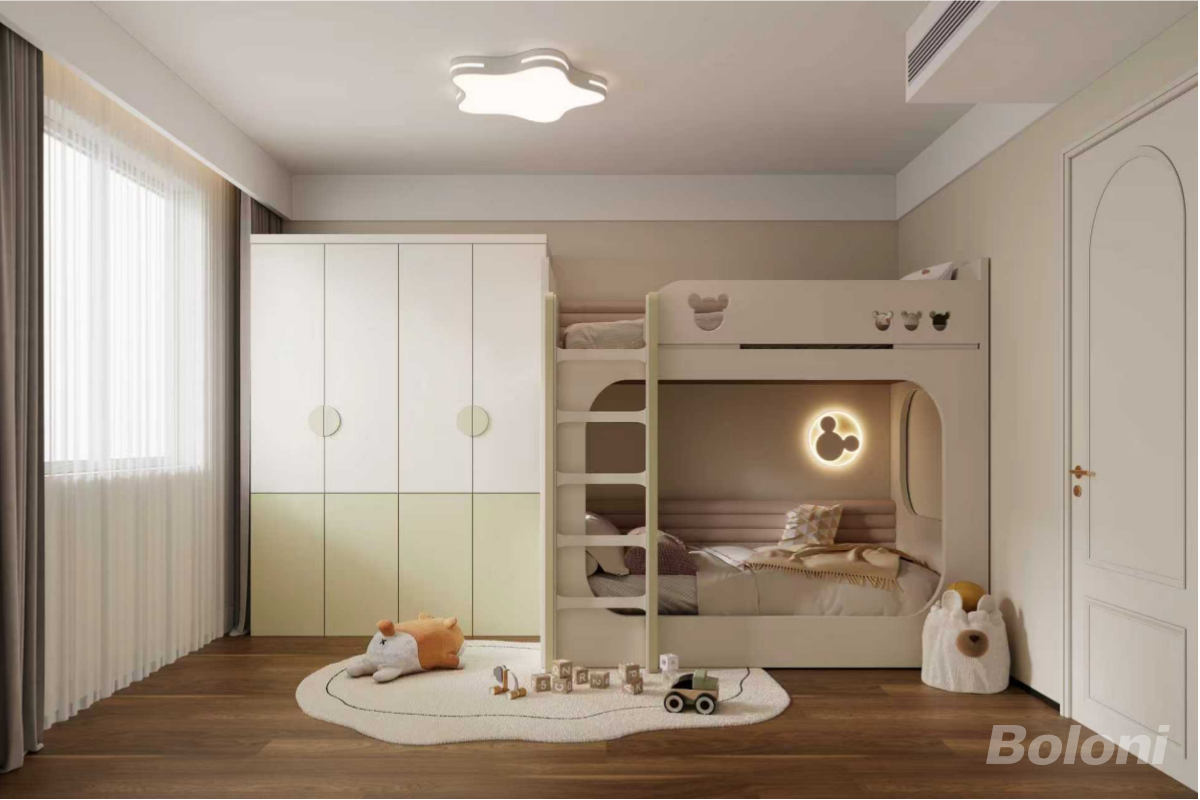 儿童房,以米白色为主色调。房间内摆放着带有卡通元素的白色双层床,床梯设计方便上下。靠墙是一组白色与浅绿色相间的衣柜,顶部安装了云朵造型的吸顶灯,地面铺有木质地板,中央放置着圆形地毯和一些玩具,营造出童趣温馨的氛围。
