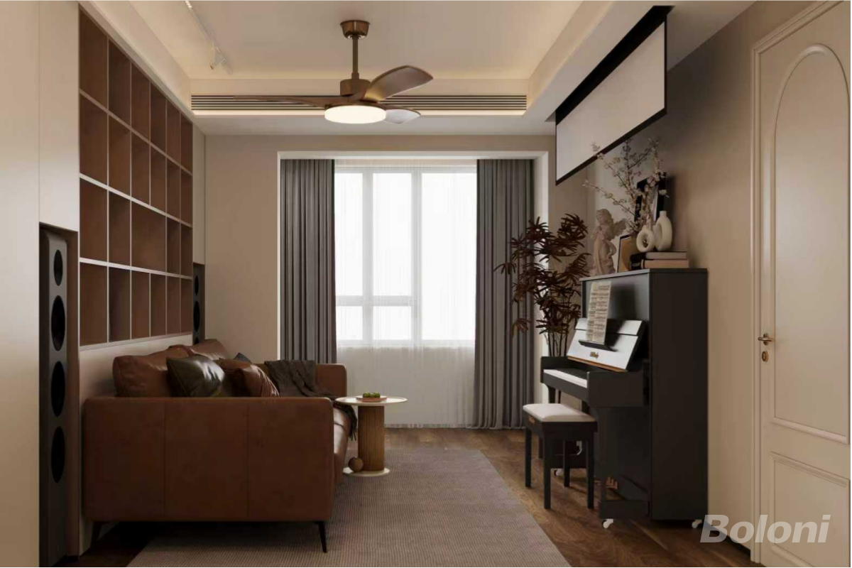 呈现客厅纵深视角,棕色皮质沙发搭配浅灰地毯,左侧是开放式格架柜体;钢琴区与窗户相邻,自然采光透过纱帘洒入,吊扇灯兼具功能性与装饰性,法式门型与柔美的软装花艺结合,柔化了深色家具的硬朗感,营造出温馨的休闲氛围。