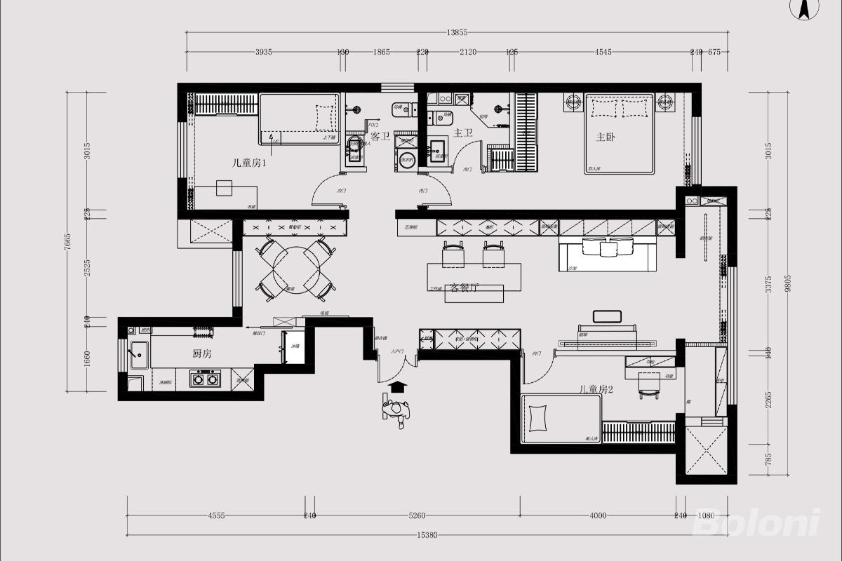 动区:客厅、餐厅、厨房集中在户型中轴区域,形成开放式公共活动空间,社交、烹饪、用餐动线流畅,且与入户门衔接自然,避免对静区的干扰。 静区:主卧、儿童房1、儿童房2分布在户型两侧及深处,远离公共活动区,保证休息空间的私密性与安静度。
